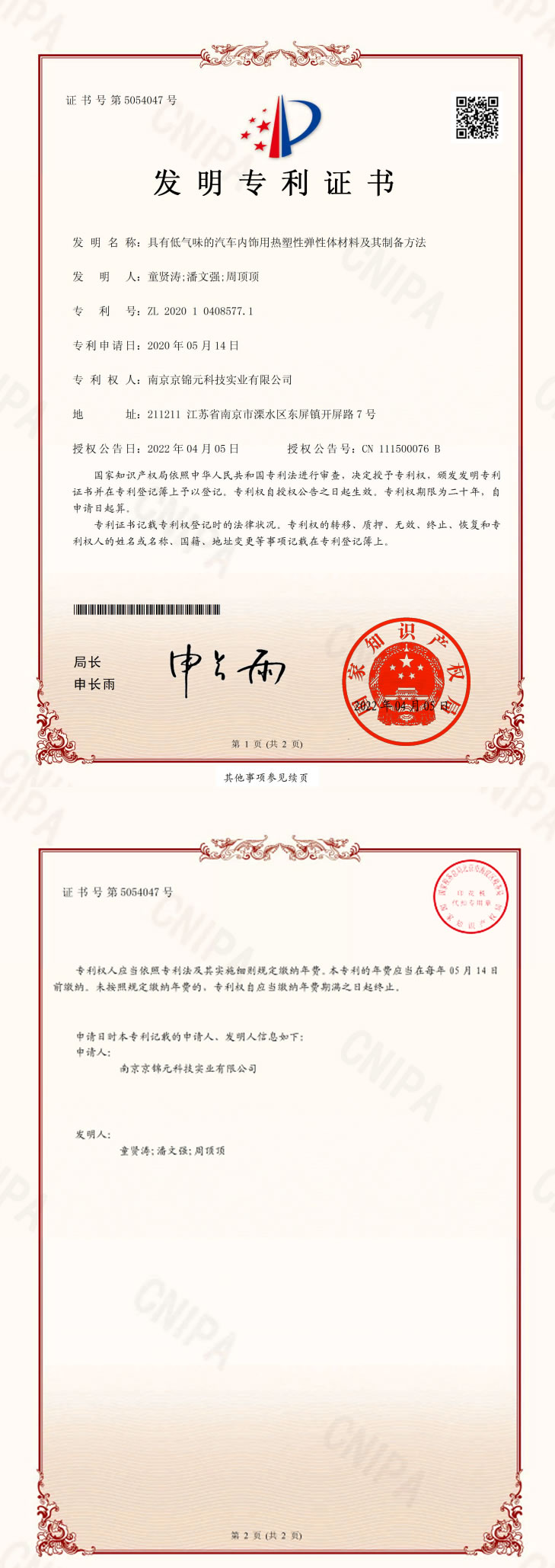 ZL 2020 1 0408577.1 具有低氣味的汽車內(nèi)飾用熱塑性彈性體材料及其制備方法